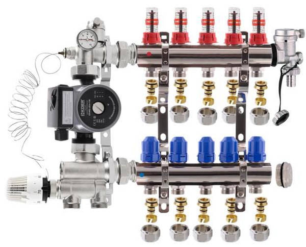 До комплекту входить: · насосно-змішувальний вузол SG01 – 1 шт. · кінцевий елемент колектора KE01-1 шт. · євроконус EK01 – 12 шт. · колекторні блоки з витратомірами …