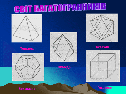 Це: тетраедр, куб, октаедр, додекаедр та ікосаедр, і це найпростіші, які утворюються з одного правильного многокутника. Ця група многогранників була відома ще …