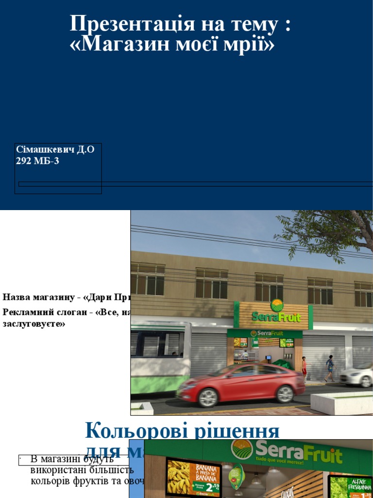 Презентація на тему : «Магазин моєї мрії». Сімашкевич Д.О 292 МБ-3. Назва магазину – «Дари Природи» Рекламний слоган – «Все, на що ви заслуговуєте»See more
