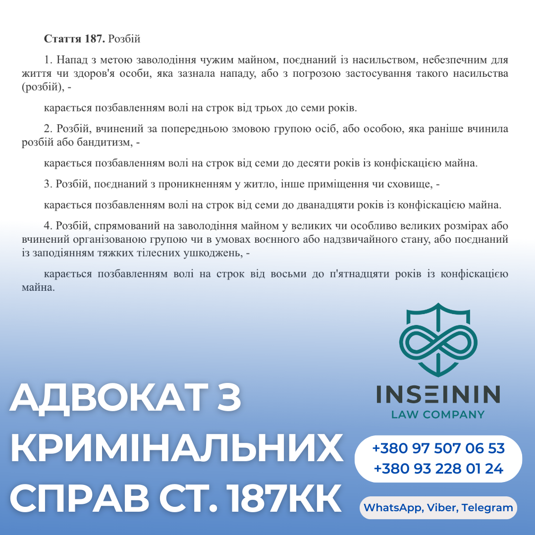 187 Кримінального кодексу України, розбій – це напад з метою заволодіння чужим майном, поєднаний із насильством, небезпечним для життя чи здоров'я особи, яка зазнала нападу, або з погрозою застосування такого насильства, –карається позбавленням волі на строк від трьох до семи років.