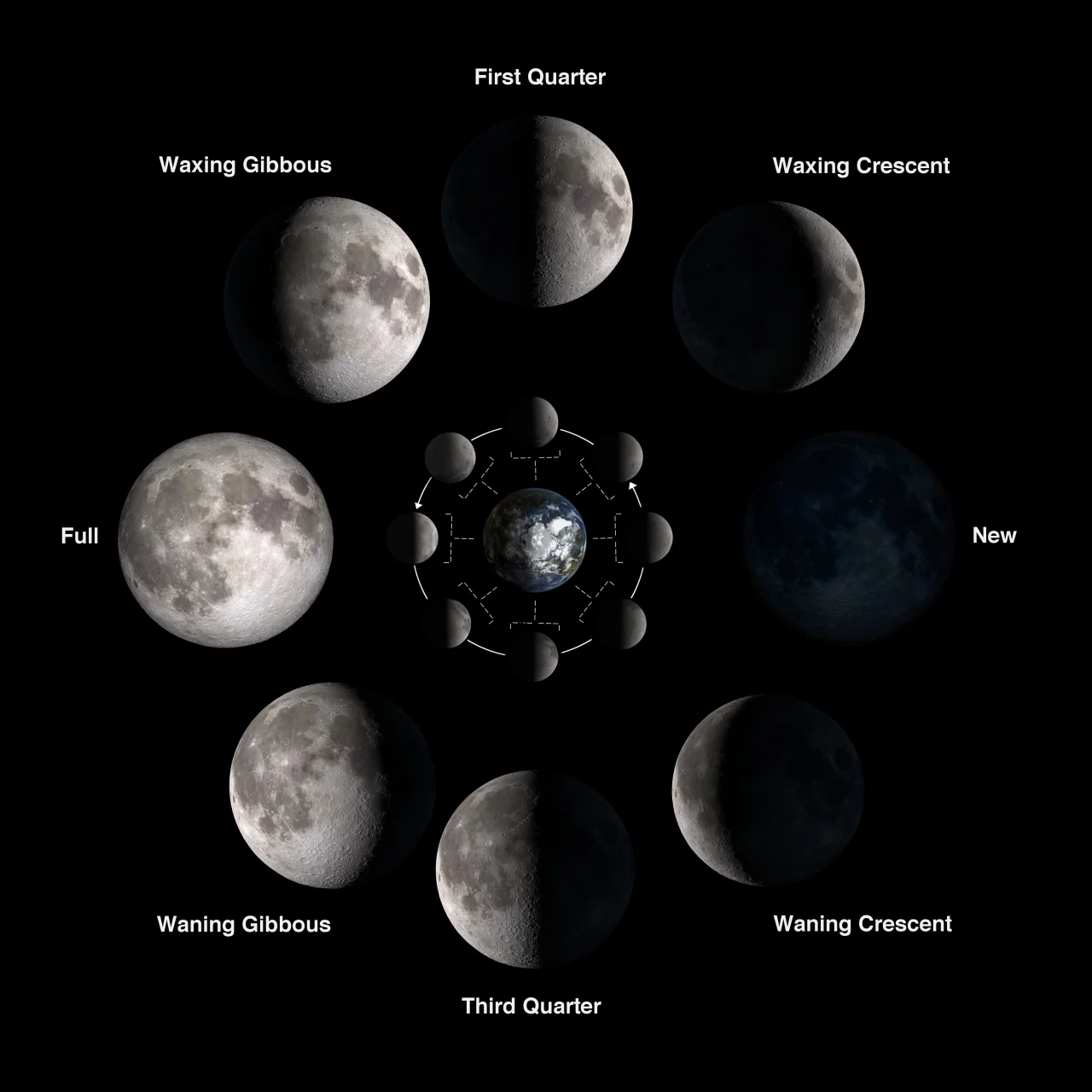 Зростальний Місяць Повний Місяць — стан, коли Місяць освітлений повністю. Спадний Місяць Остання чверть — стан, коли Місяць знову освітлений на половину.