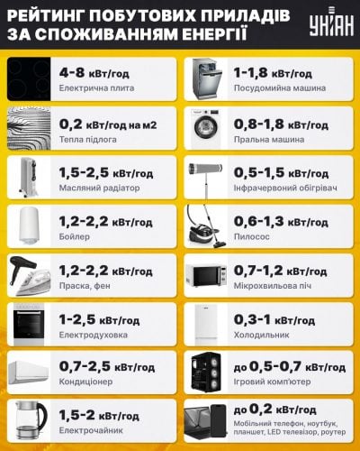електрична плита – 3,5 кВт-год · кондиціонер – 3 кВт-год · фен – 2,2 кВт-год · електрочайник – 2,2 кВт-год · праска – приблизно 2,2 кВт-год · бойлер …